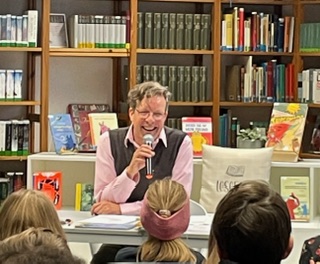 Lebhaft und vor allem lustig war es bei den Lesungen des Kieler Dichters Arne Rautenberg am 11.11.25 in der Gemeindebücherei. Der mit zahlreichen Preisen ausgezeichnete Künstler besuchte die 3. und 4. Klassen im Rahmen der Kinder-und Jugendbuchwochen bereits zum dritten Mal.